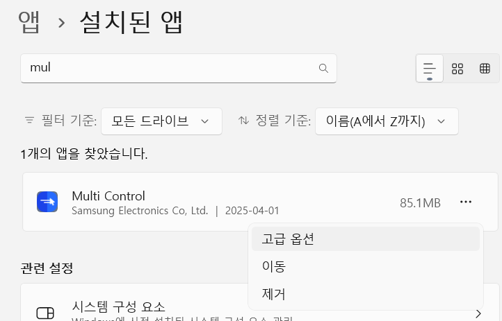 재설치해야겠다 싶어서 지우려고 들어갔다가 고급옵션들어가봤다.